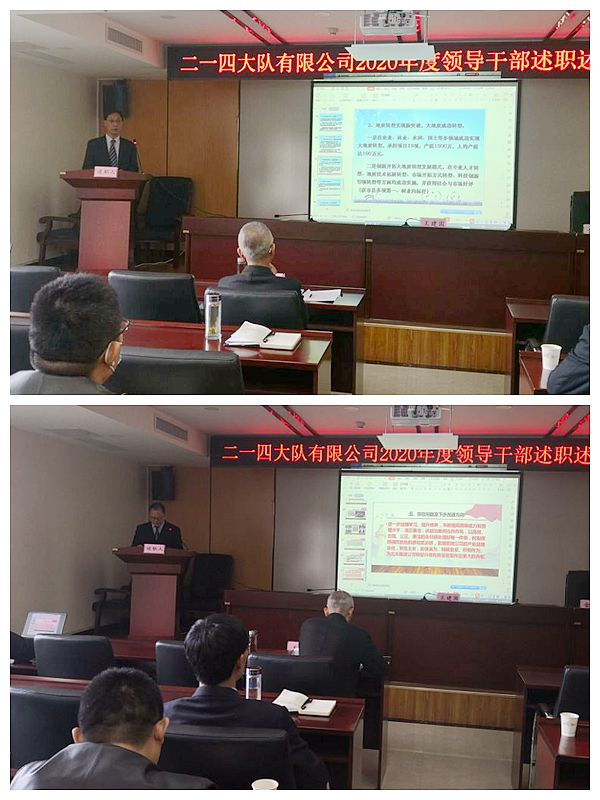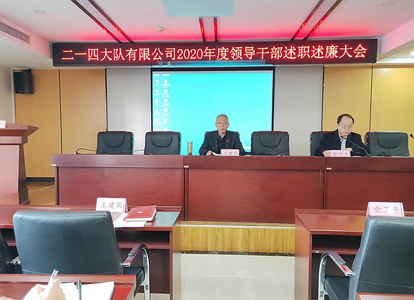 2021年1月12日,集團公司黨委副書記王建國率黨建工作考核組,對二一四大隊有限公司2020年黨建工作目標任務完成情況、領導班子及其成員履職進行黨建目標綜合考核,召開了領導干部述職述廉大會,會議由集團公司黨委工作部部長金衛平主持,公司領導班子成員、中層干部和職工代表共35人參加了會議。