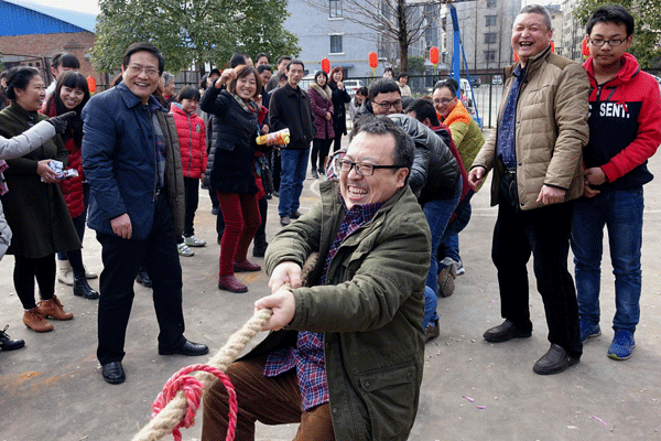 活動(dòng)在震天的煙花爆竹聲、歡慶的鑼鼓聲、歡快的秧歌舞中拉開了序幕,工會(huì)舞蹈興趣組的女職工身穿紅色節(jié)日裝,手提紅燈籠進(jìn)行了喜慶方隊(duì)的表演;參加游藝活動(dòng)的職工、家屬已有序在各項(xiàng)活動(dòng)前排好了隊(duì),飛鏢、搶凳子、定點(diǎn)投籃、齊心協(xié)力,皮球入門、盲人敲鑼、釣魚、套環(huán)、擲沙包、筷子入瓶等刺激好玩的游戲逐一展開,每種游戲項(xiàng)目都吸引了許多職工、家屬參加,大家爭(zhēng)先恐后,積極踴躍參加,現(xiàn)場(chǎng)人頭攢動(dòng),氣氛熱烈,笑聲不斷。搶凳子吸引了大批兒童,既要跑起來又要聽裁判的敲鑼聲,小朋友們?cè)鷮?shí)秀了一把;三人配合項(xiàng)目體現(xiàn)了齊心協(xié)力合作精神……;再看各分會(huì)拔河隊(duì)員個(gè)個(gè)鉚足了勁,使盡渾身力氣參與較量,呼喊聲、加油聲一浪高過一浪,笑聲、加油聲互相映襯,此起彼伏。多姿多彩的文化活動(dòng)將節(jié)日氣氛推向了高潮。