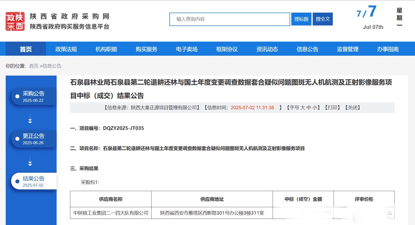 近日,公司物化探院成功中標《石泉縣第二輪退耕還林與國土年度變更調(diào)查數(shù)據(jù)套合疑似問題圖斑核查項目》及《石泉縣第二輪退耕還林與國土年度變更調(diào)查數(shù)據(jù)套合疑似問題圖斑無人機航測及正射影像服務項目》。