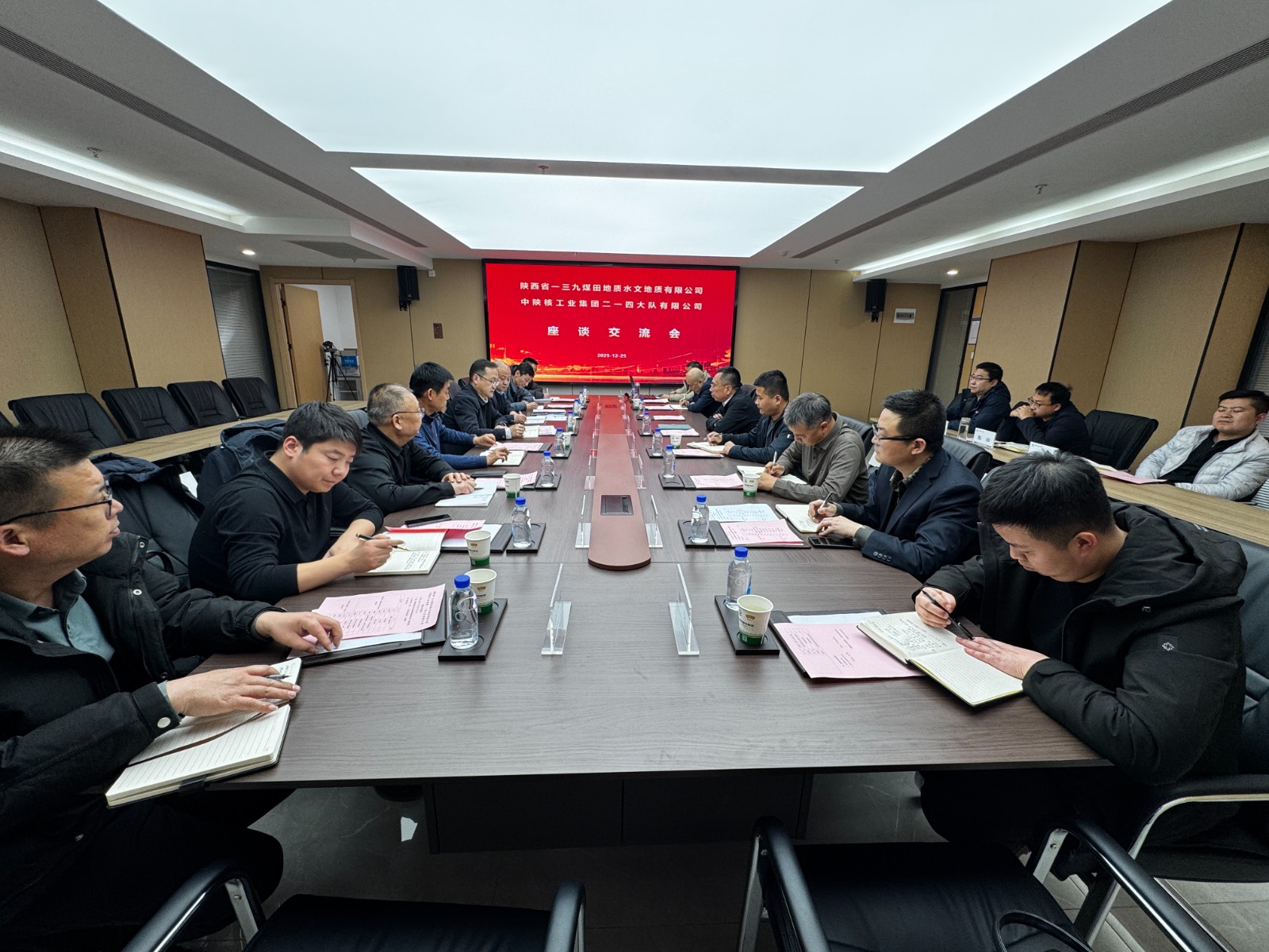 2025年12月25日下午,陜西省一三九煤田地質(zhì)水文地質(zhì)有限公司黨委副書記、總經(jīng)理王文飛一行,赴中陜核二一四隊(duì)開展座談交流,雙方圍繞技術(shù)創(chuàng)新應(yīng)用與項(xiàng)目協(xié)作事宜深入探討,凝聚合作共識(shí)。