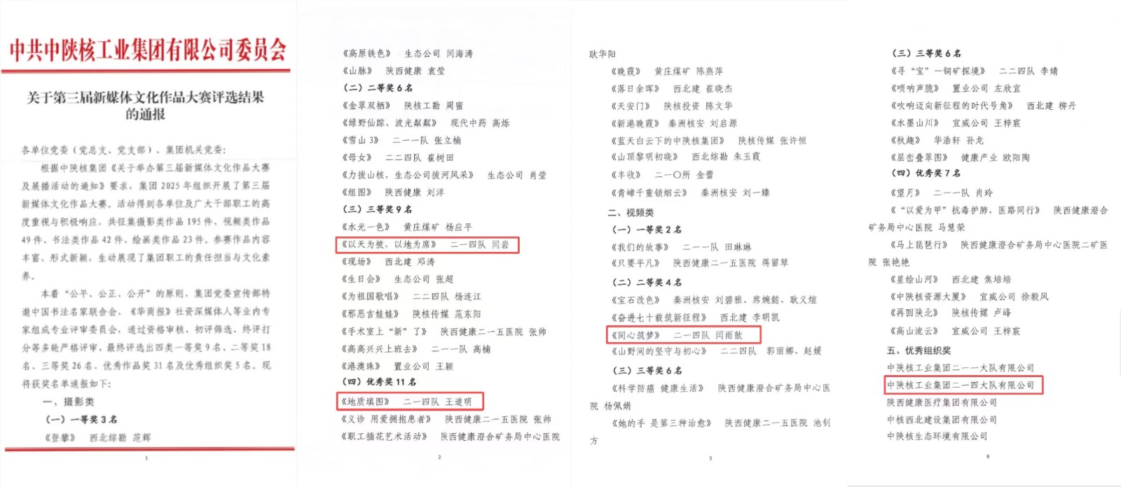 在第三屆新媒體文化作品大賽中,二一四隊(duì)選送的視頻作品《同心筑夢》(作者:閆雨歆)憑借其精良的制作、深刻的主題,從眾多參賽作品中脫穎而出,榮獲視頻類二等獎(jiǎng);攝影作品《以天為被,以地為席》(作者:閆巖)和《地質(zhì)填圖》(作者:王道明)分別獲得三等獎(jiǎng)和優(yōu)秀獎(jiǎng),這些作品生動(dòng)展現(xiàn)了地質(zhì)工作者在野外作業(yè)中的真實(shí)場景和精神風(fēng)貌,成為二一四隊(duì)文化宣傳的亮麗名片。