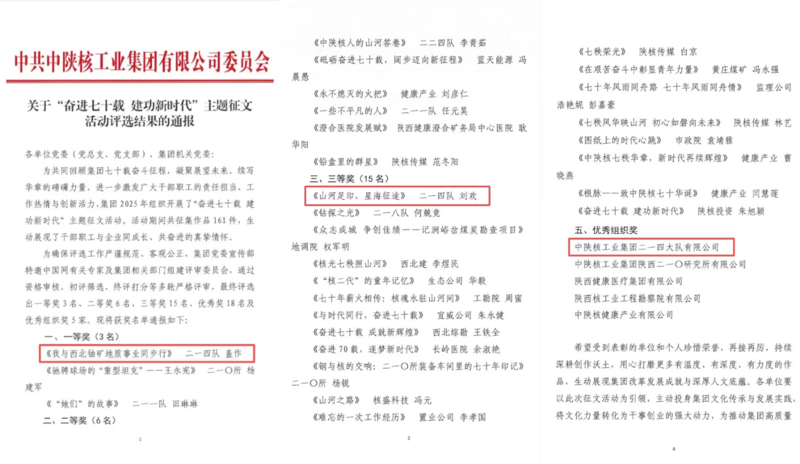 在“奮進(jìn)七十載建功新時(shí)代”主題征文比賽中,二一四隊(duì)選送的征文《我與西北鈾礦地質(zhì)事業(yè)同步行》(作者:蓋作)以真摯的情感、生動(dòng)的細(xì)節(jié)和深刻的主題,榮獲征文類一等獎(jiǎng);《山河足印,星海征途》(作者:劉歡)則憑借其對地質(zhì)事業(yè)的深刻理解和詩意表達(dá),獲得征文類三等獎(jiǎng)。這兩篇征文不僅展示了二一四隊(duì)在西北鈾礦地質(zhì)事業(yè)中的歷史貢獻(xiàn)和現(xiàn)實(shí)成就,也體現(xiàn)了地質(zhì)工作者對事業(yè)的忠誠與熱愛。