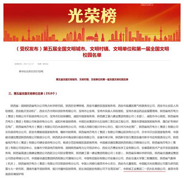 2017年11月17日,全國精神文明表彰大會在北京召開。會上隆重表彰了第五屆全國文明城市、文明村鎮、文明單位。中陜核工業集團二一四大隊有限公司榜上有名,榮獲“第五屆全國文明單位”殊榮。據了解,全國文明單位每三年評選一次,是國家精神文明建設綜合性獎項的最高榮譽。