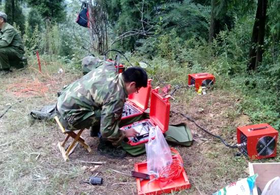 林中荊棘密布,刺藤遍野,大家硬是靠雙手砍出一條條小路來。被樹根絆倒時,爬起來拍拍屁股上的浮土繼續前行;被蟲子叮咬過敏奇癢時,掏出隨身藥水抹一抹;餓了,就著榨菜吃口饅頭;渴了,來口自帶涼白開……披著被汗浸濕的衣服,布設測線檢查著每一個電極,收集好每一道數據。物探組十幾個人同時作業,相互間一環扣一環,每一環節都必須確保無誤。只有縝密計劃和充分協調配合,才能達到最佳工作效果。