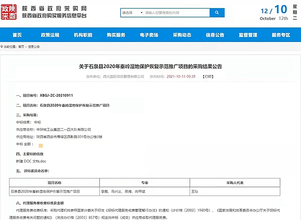 10月11日,陜西省政府采購網(wǎng)公示,公司成功中標石泉縣2020年秦嶺濕地保護恢復示范推廣項目。